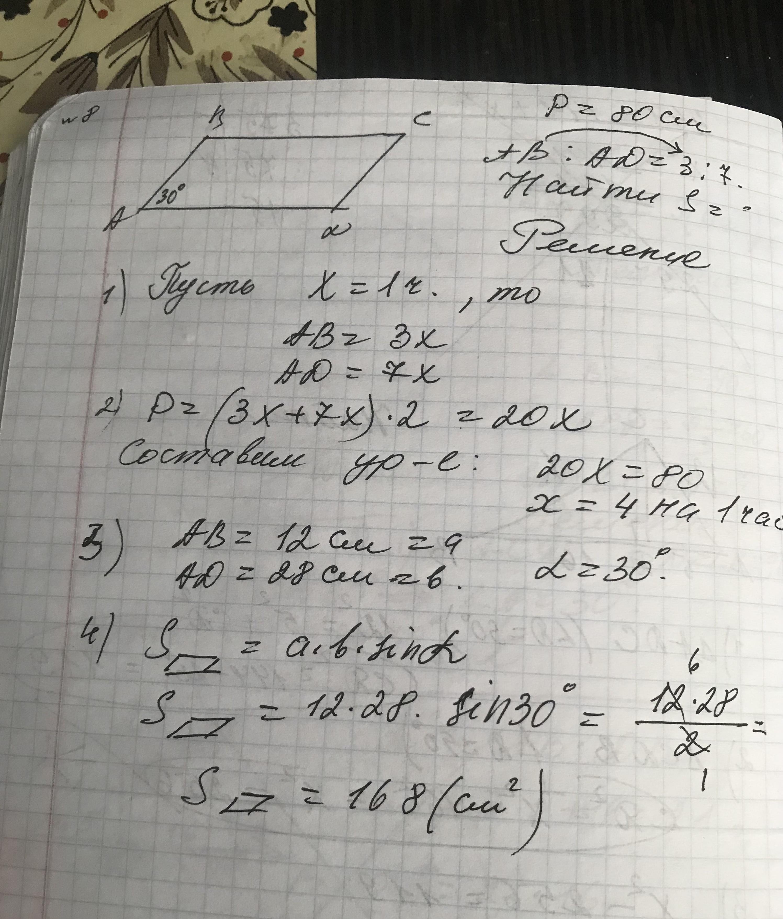 Острый угол параллелограмма равен 30 градусов,периметр 80 см,стороны относятся 3:7.Найдите площадь этого параллелограмма.