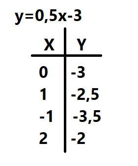 Побудувати графіки можна за допомогою таблички (приклад до першого графіка на фото, для інших просто підбираємо довільні значення х і підставляємо їх у функцію для знаходження у. Далі відмічаємо точки на числовій прямій. Ось такий малюнок повинен вийти у кінці (зелений: y = 0,5x-3, синій: y =-4x+6, жовтогарячий: y=-x).