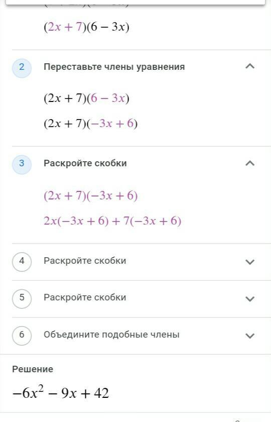 выполнить умножение двучленов и привести подобные слагаемые (7+2x) (6-3x)