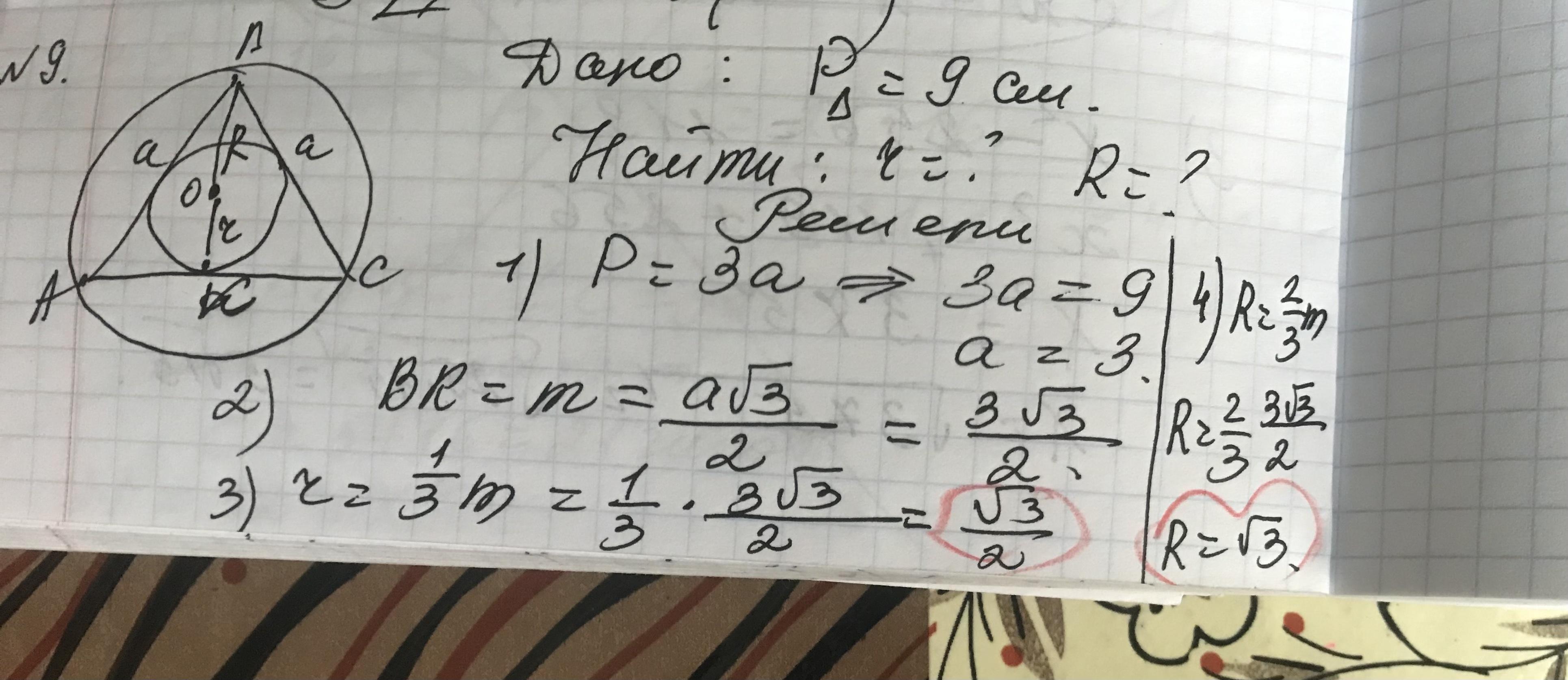 Найдите радиусы вписанной и описанной окружностей около равностороннего треугольника с периметром равным 9 см
