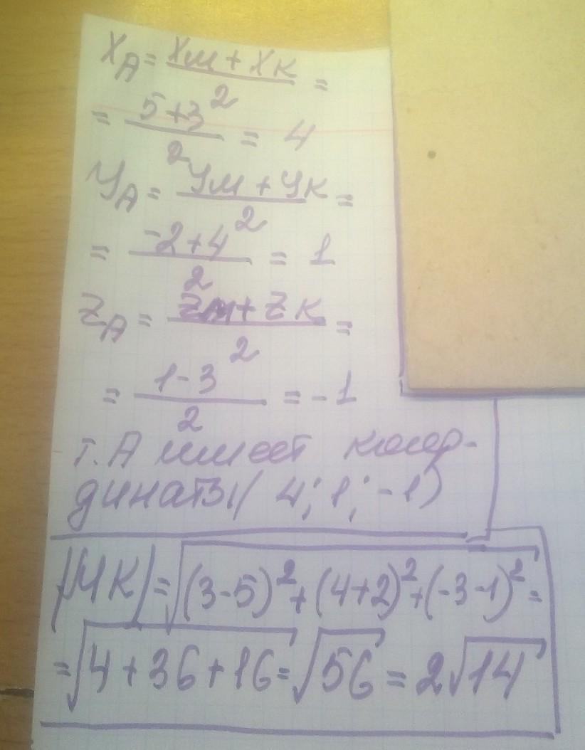 точка А середина відрізка МК. Знайдіть координати точки А та довжину відрузка МК, якщо М(5 ;-2; 1), К(3, 4, -3).