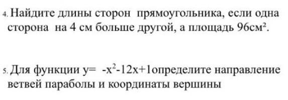 Пусть одна сторона прямоугольника равна х см, тогда другая (х+4) см. Известно, что площадь прямоугольника равна 96 см^2. Имеем уравнение: