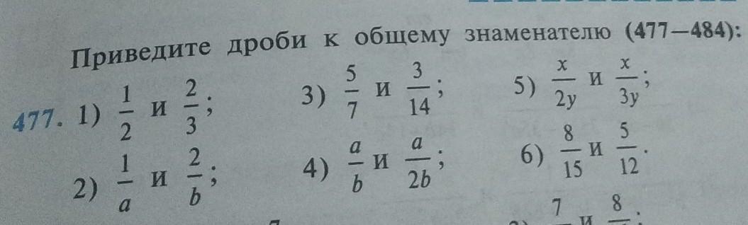 У меня лично получается: 1) 3/6, 4/6. 2)1b/ab, 2a/ab. 3)10/14, 3/14. 4) 2a/2b(это 1, но ради решения так), a/2b. 5) 3x/6y, 2x/6y. 6) 32/60, 25/60