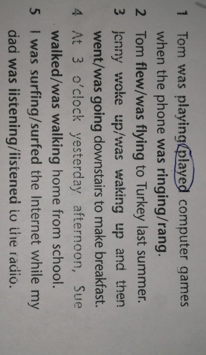 1 playing, rang 2 flew 3 woke up, went 4 walked 5 was surfing, was listening