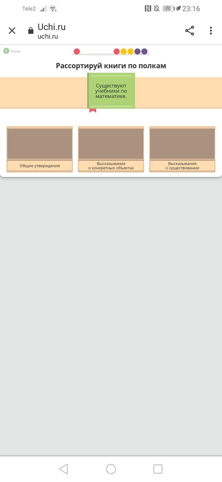 Ну воь смотри у тебя там есть такая табличка с надписью"существуют учебники по математике и ты нажимаешь на неё и зажимаешь правую кдавишу на мышке и переносишь её в ту табличку которая должна давать правильное утверждение зелёной таблицы я так думаю это зеленая соответствует той коричневой с надписью"общие утверждения если ещё там есть такое задание то тогда так же перетаскивай в нужную табличку ту табличку"