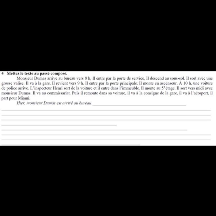 Hier, monsieur Dumas est arrivé au bureau vers 8h . Il est entré par la porte de service. Il est descendu au sous-sol. Il est sorti avec une grosse valise. Il est allé à la gare. Il est revenu vers 9h. Il est entré par la porte principale. Il est monté en ascenseur. A 10h une voiture de police est arrivée. L'inspecteur Henri est sorti de la voiture et il est entré dans l'immeuble. Il est monté au 5e étage. Il est sorti vers midi avec Monsieur Dumas . Il est allé où commissariat. Puis il est remonté dans sa voiture. Il est allé à la consigne de la gare, il est allé à l'aéroport, il est parti pour Miami