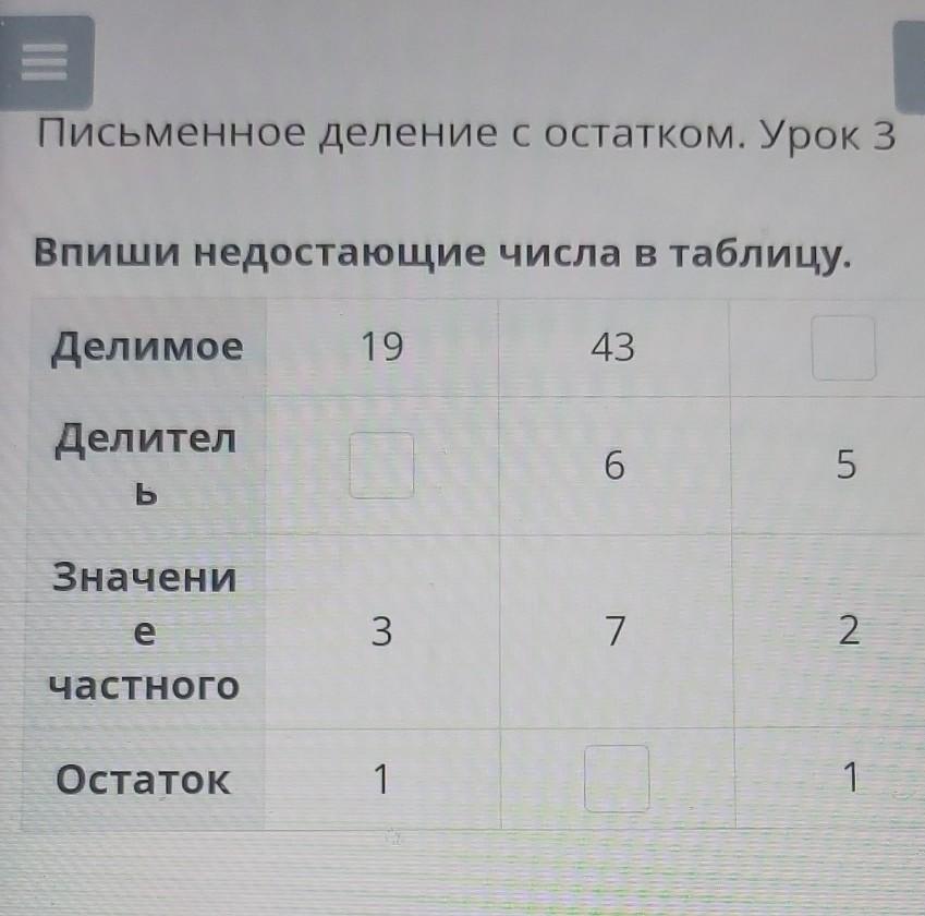 1 делитель -6 (19/6=3, +1) (6*3=18)