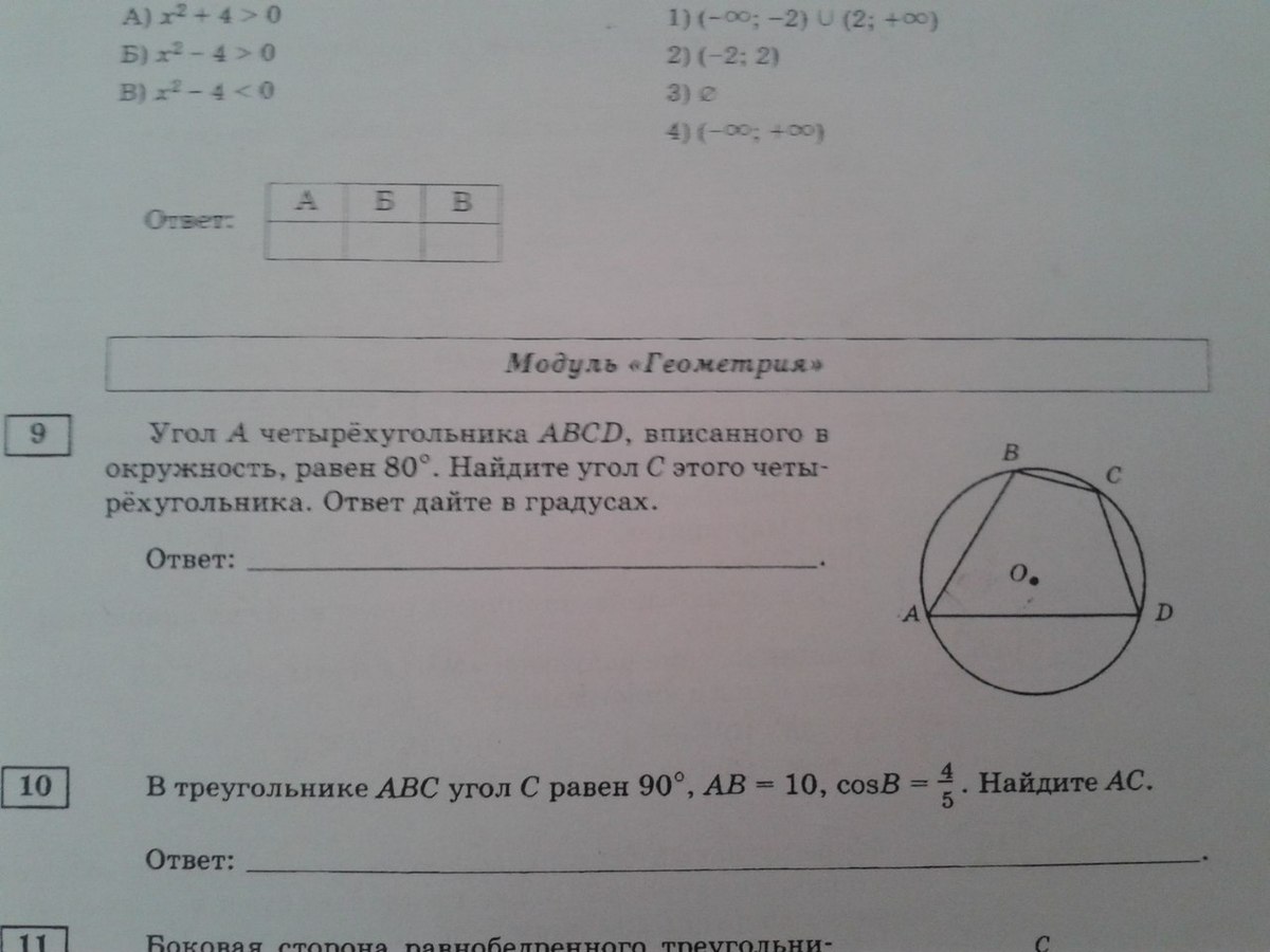 9). Если вокруг четырехугольника можно описать окружность, то сумма противополож. углов 180. A+C=180