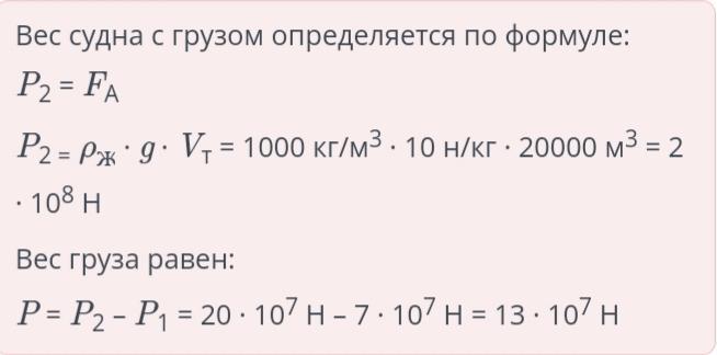 судно, погруженное в воду до ватерлинии, вытесняет воду в объеме 20000м³. вес судна без груза равен 7•10⁷Н. определи, чему равен вес груза.