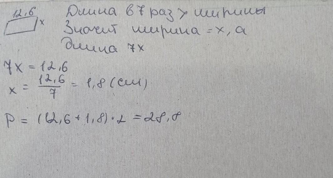 Длина прямоугольника 12,6 см, а ширина в 7 раз меньше длины. Найди периметр прямоугольника.