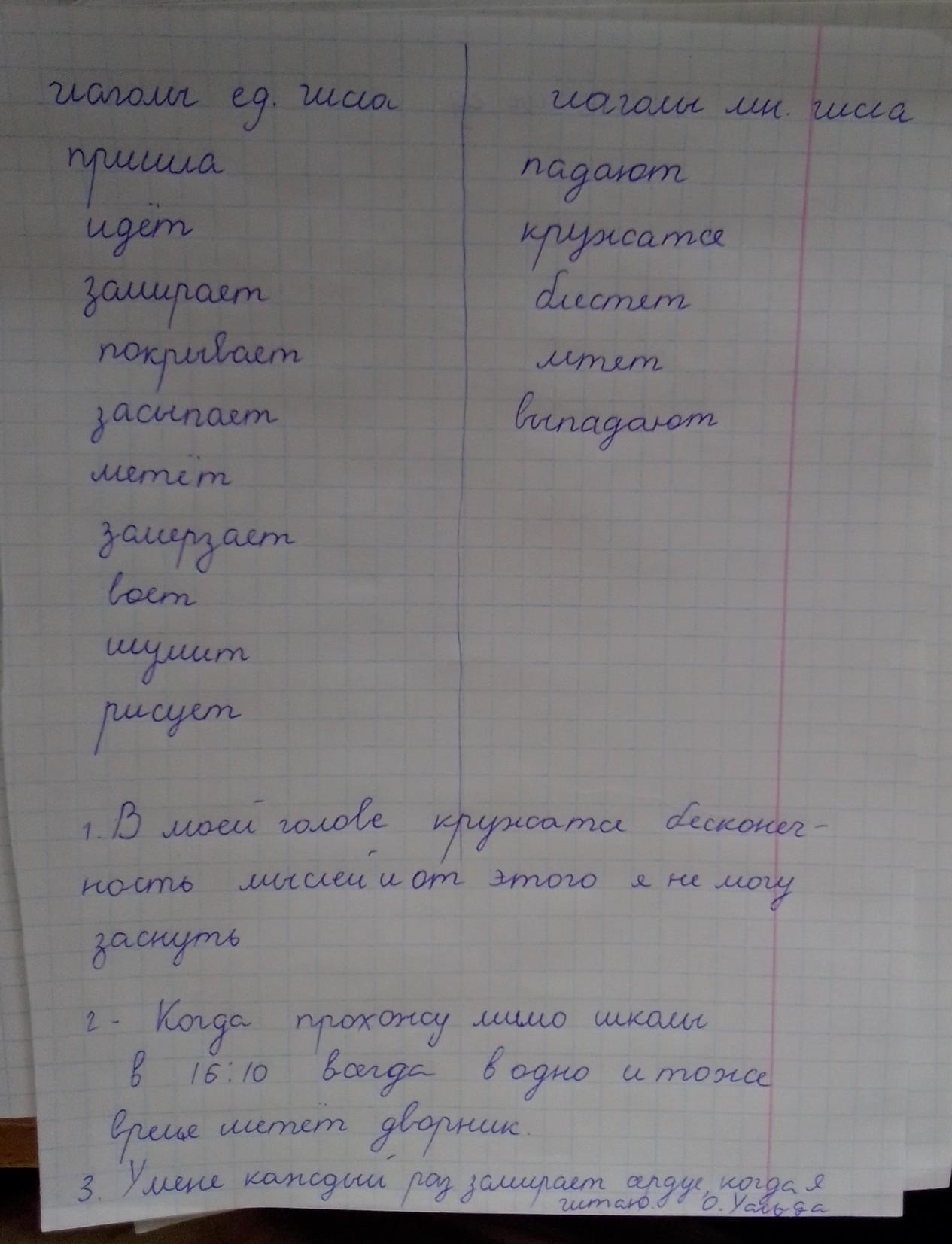 выпиши сначала глаголы в единственном числе потом глаголы в множественном числе пришла идет падают кружатся замирает покрывает засыпает метет замерзает воет шумит блестят рисует летят выпадают потом составь и запиши три предложение с этими глаголами