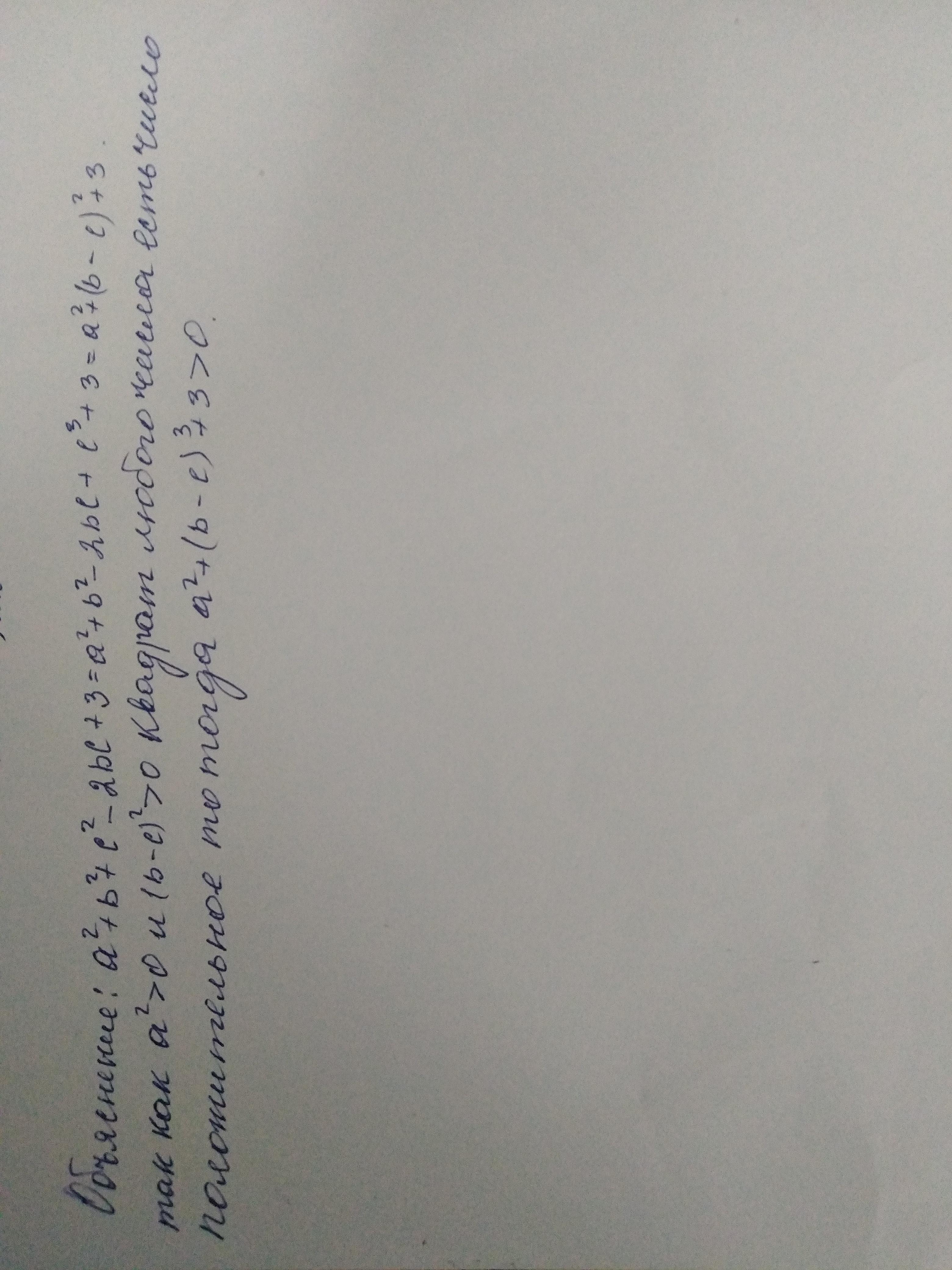 а так как a²>0 и (b-c)²>0 (так как квадрат любого числа есть число неотрицательное) => a²+(b-c)²+3>0