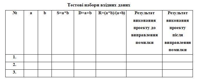 3. Створіть три тестових набори вхідних даних для тестування проекту. Створіть таблицю за зразком у текстовому процесорі Miсrosoft Word. (ФОТО 5)