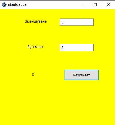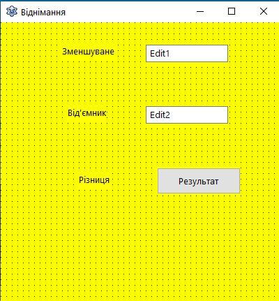 3. Задайте формі розмір 400х400 та дайте їй назву “Віднімання”. Для цього змініть значення властивостей Height – 400, Width – 400, Caption –“Віднімання ” в Інспекторі об’єктів. Змініть колір форми на жовтий.