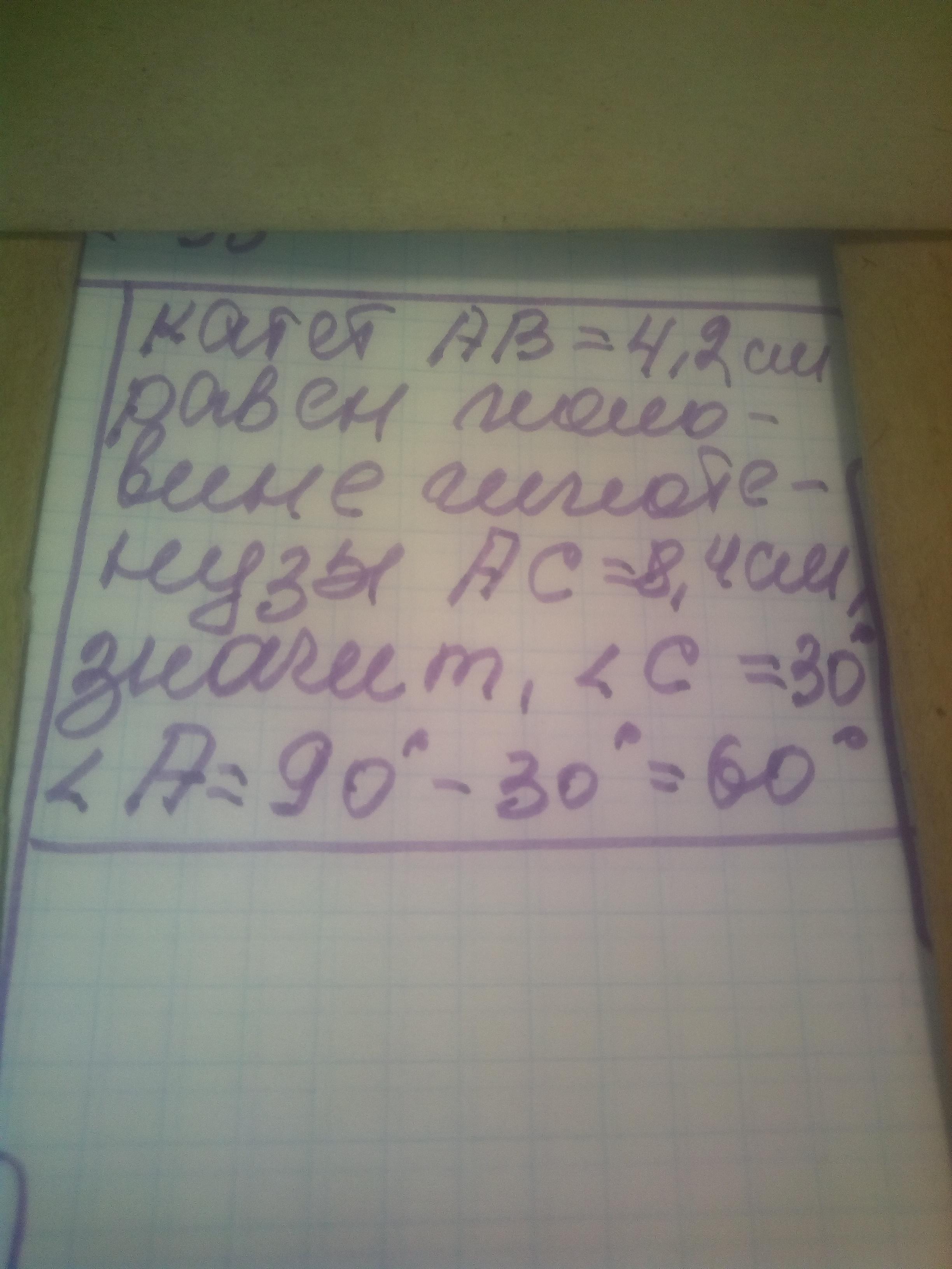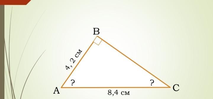 если АВ=4,2 это значит что он равен половине гипотенузы,а по теореме сказано напротив стороны равной половине гипотенузы лежит угол 30 градусов.Значит угол С=30 градусов,Тогда угол А,=90-30=60