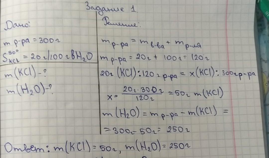 1. Если растворимость хлорида калия при 50 ° C составляет 20 г / 100 г воды, сколько вещества и сколько воды необходимо для приготовления 300 г раствора?