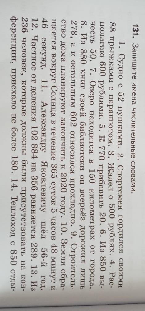 1. Судно с пятьюдесятью двумя пушками.2. Спортсмен гордился своими восемьюдесятью восемью прыжками с парашютом. 3. Жалел о пятистах рублях. 4. Располагаю шестьюстами рублями. 5. К семистам семидесяти прибавить двадцать. 6. Из восьмисот пятидесяти вычесть пятьдесят. 7. Озеро находилось в ста пятидесяти километрах от города. 8.Из восьмисот восьмидесяти книг своей библиотеки он всерьез дорожит лишь двумястами семьюдесятью восемью ,а к остальным шестистам двум относился прохладно. 9. Строительство дома планируется закончить к двум тысячам двадцатому году.10. Земля обращается вокруг Солнца в течении трехсот шестидесяти пяти суток, пяти часов ,сорока восьми минут и сорока шести секунд. 11. Александру Яковлевичу шел пятьдесят шестой год. 12. Частное от деления ста двух тысяч восьмисот восьмидесяти четырех на триста пятьдесят шесть равняется двустам восьмидесяти девяти.13. Из двухсот тридцати шести человек ,которые должны были присутствовать на конференции, приехало не более ста восьмидесяти. 14. Теплоход с восемьюстами пятьюдесятью отдыхающими (?)