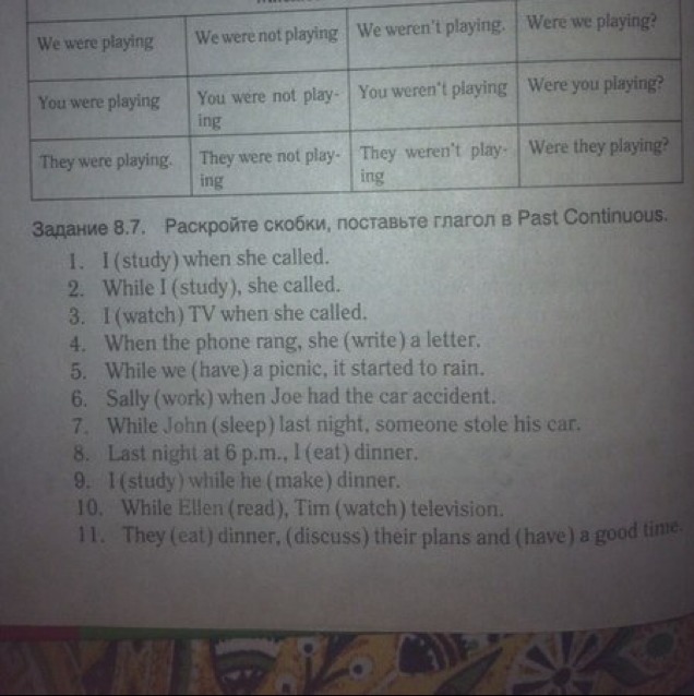 4 was writing 5 were having 6 was working 7 was sleeping 8 was eating 9 was studying, was making 10 was reading, was watching 11 were eating, discussing and