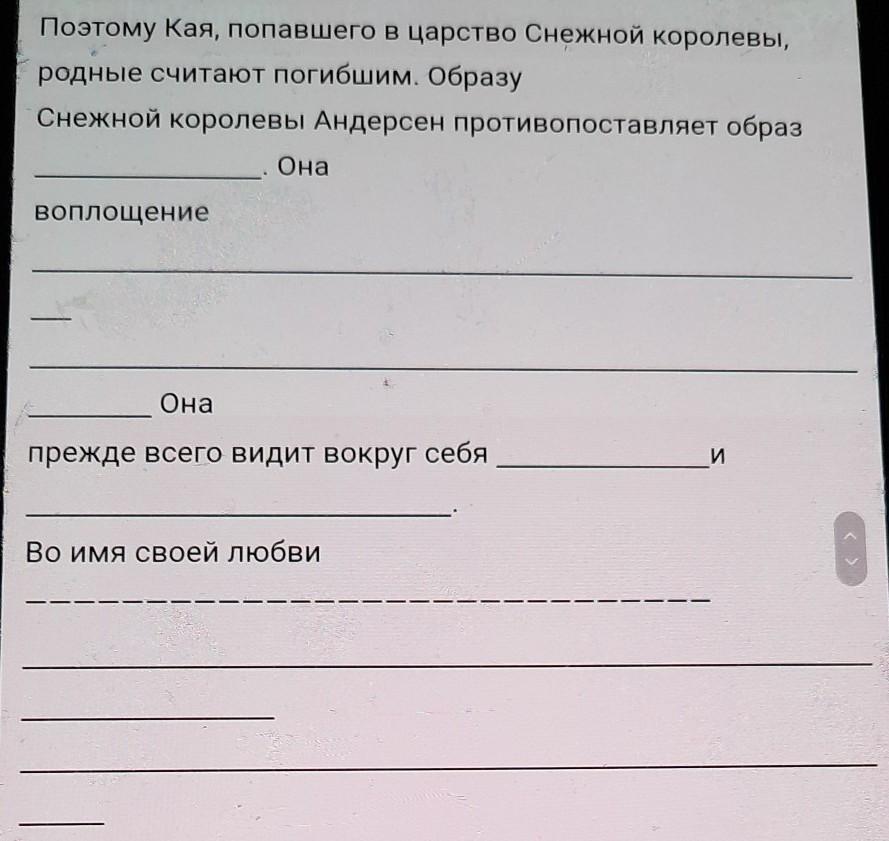 Поэтому Кая, попавшего в царство Снежной Королевы, родные считают погибшим. Образу Снежной Королевы Андерсен противопостовляет образ ГЕРДЫ. Она воплощение ДОБРОТЫ И САМООТВЕРЖЕННОСТИ . Она прежде всего видит вокруг себя добро и благородство.