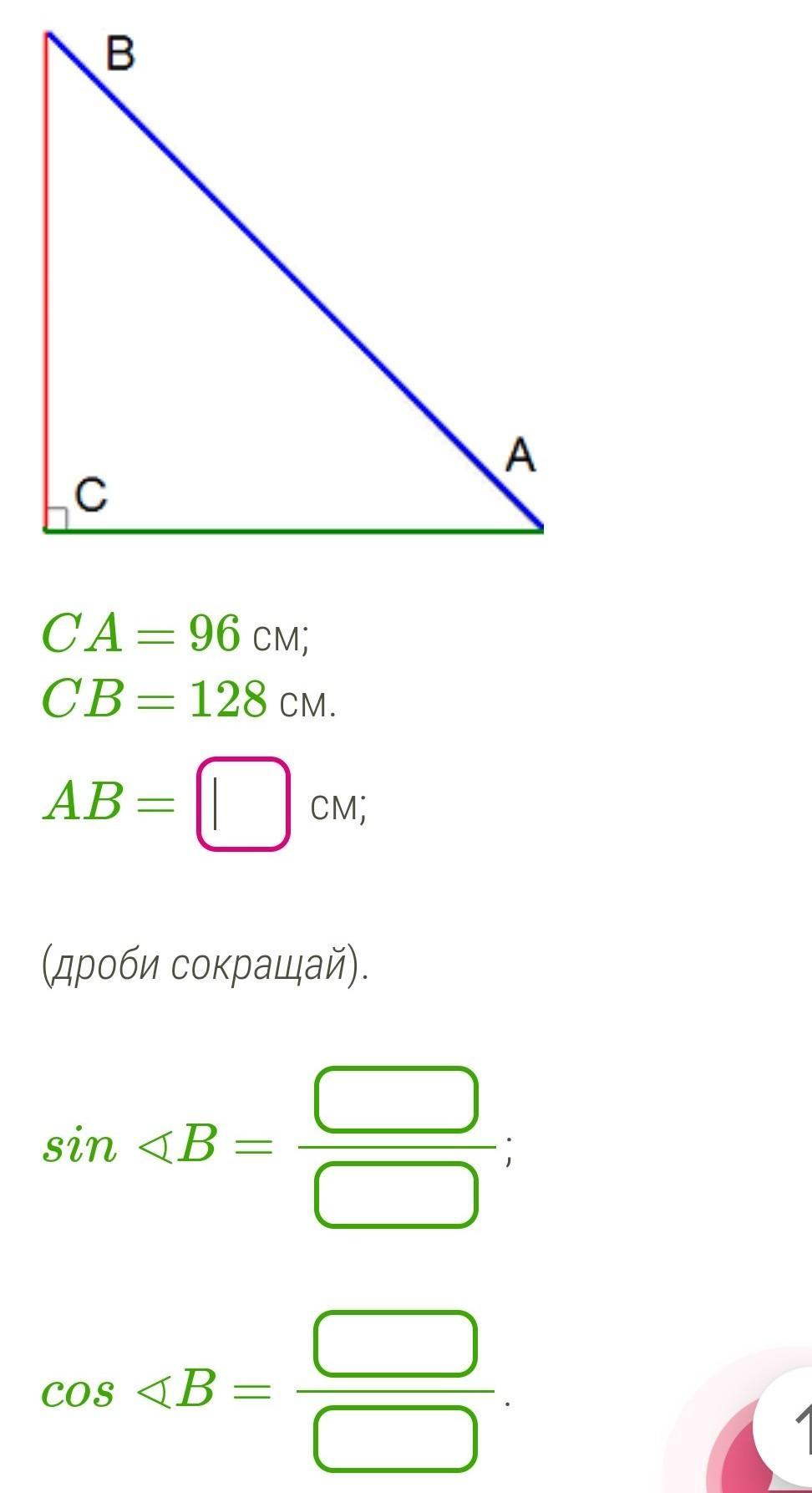 АВ=√(СВ²+СА²)=√(96²+128²)=