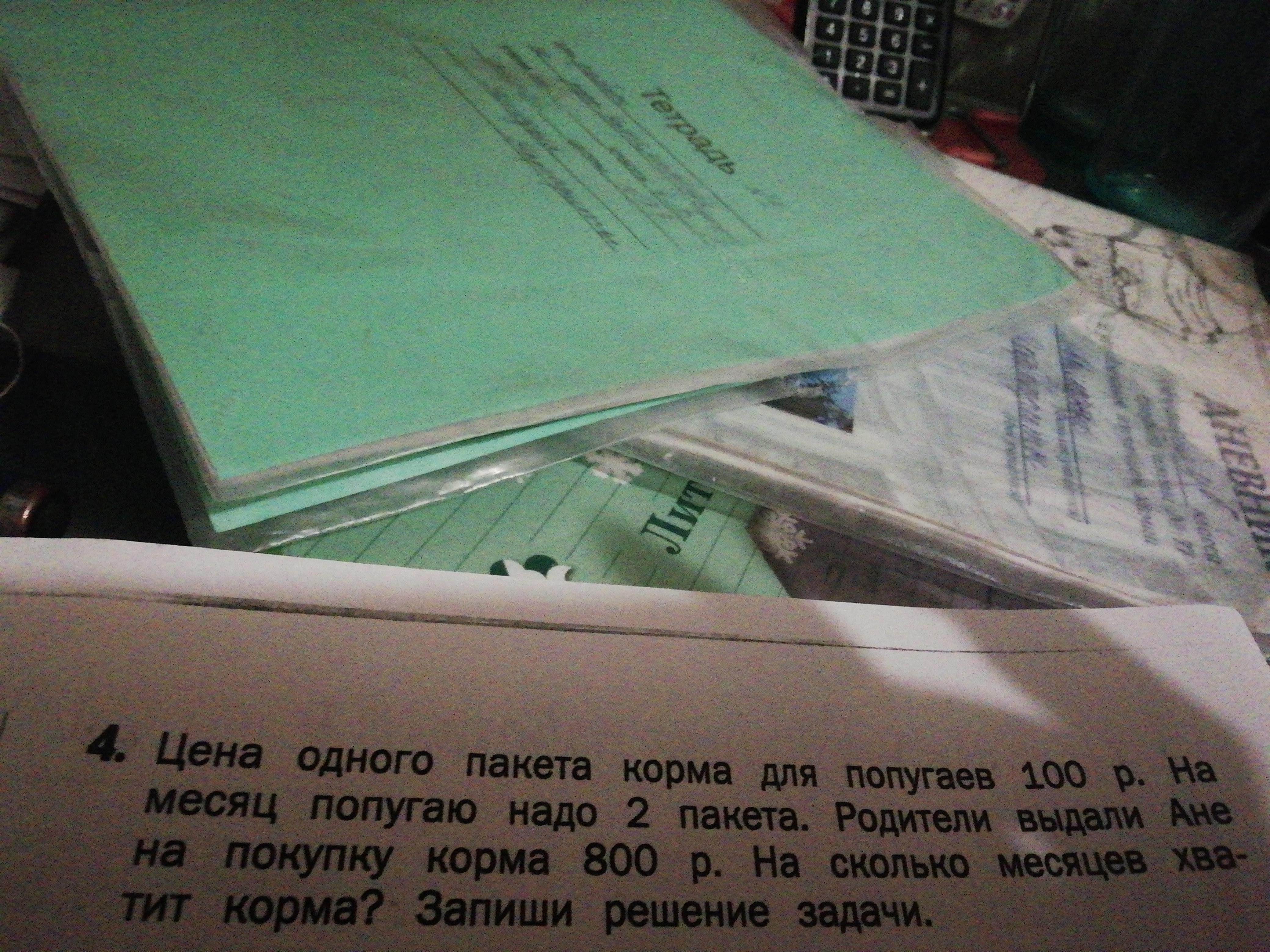Цена одного пакета корма для попугаев 100руб на месяце попугая надо два пакета родители выдали Ане на покупку корма 800 руб На сколько месяцев хватит корма?
