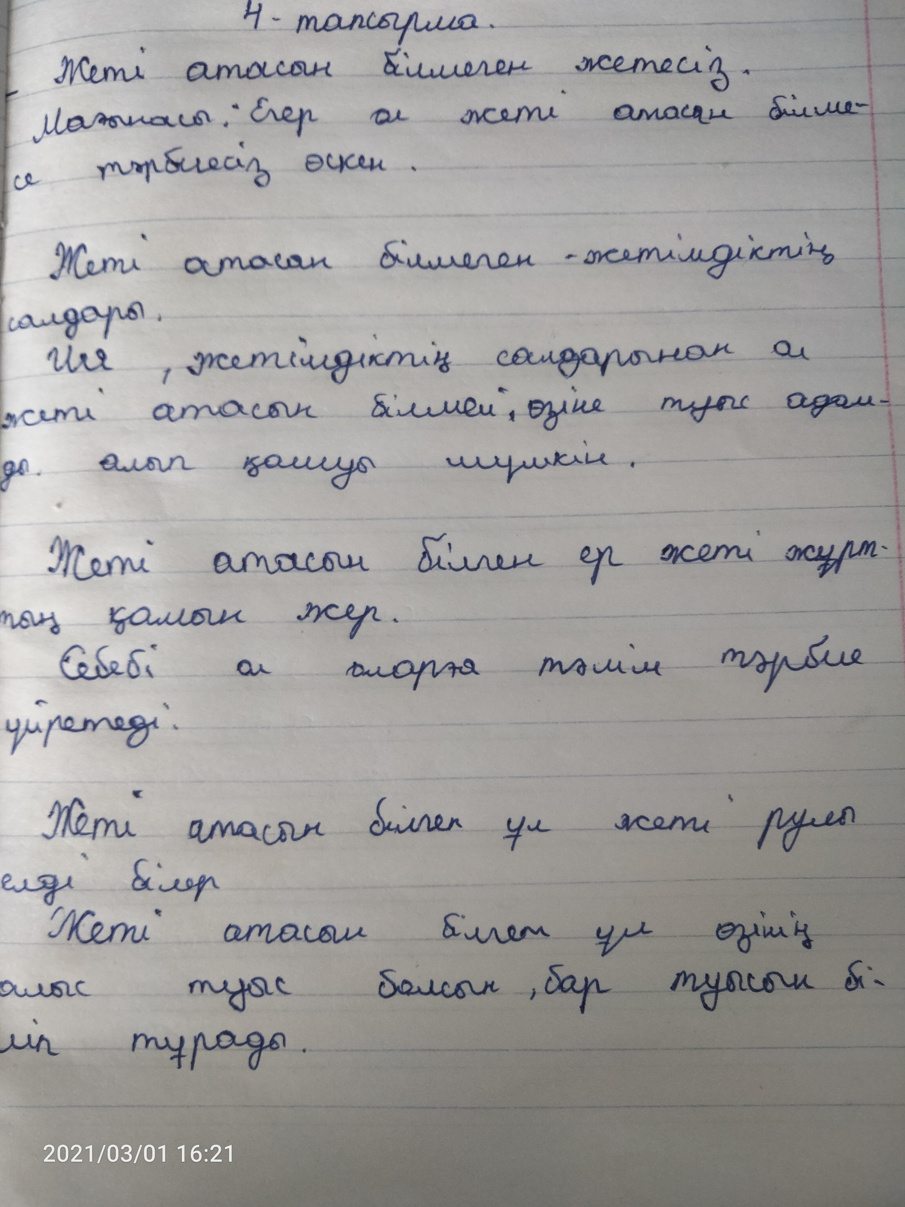 4. Төмендегі мақал - мәтелдердің мағынасын түсіндіріңдер .