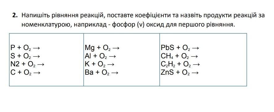 2. Напишіть рівняння реакцій, поставте коефіцієнти та назвіть продукти реакцій за