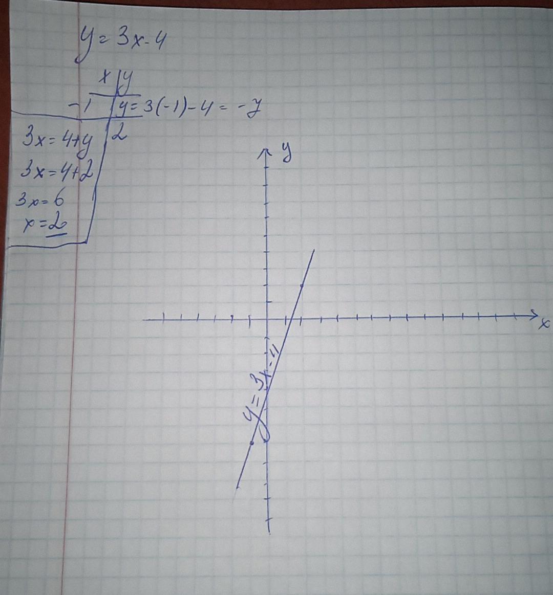 Побудуйте графік функції у=3х-4 Користуючись графіком, знайдіть а) значення функції при х=-1 б). значення аргументу при якому у=2
