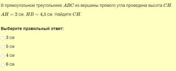 В прямоугольном треугольнике авс из вершины сн прямого угла проведена высота . ан 2 см, вн 4.5 см. Найдите сн.