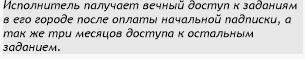 Исполнитель получает вечный доступ а заданиям в его городе после оплаты начальной подписки, а также три месяца доступа к остальным заданиям.