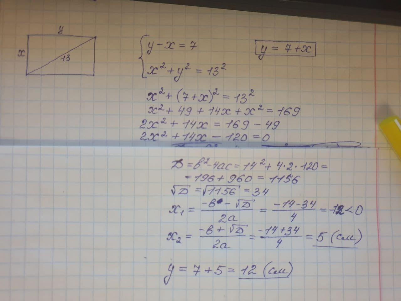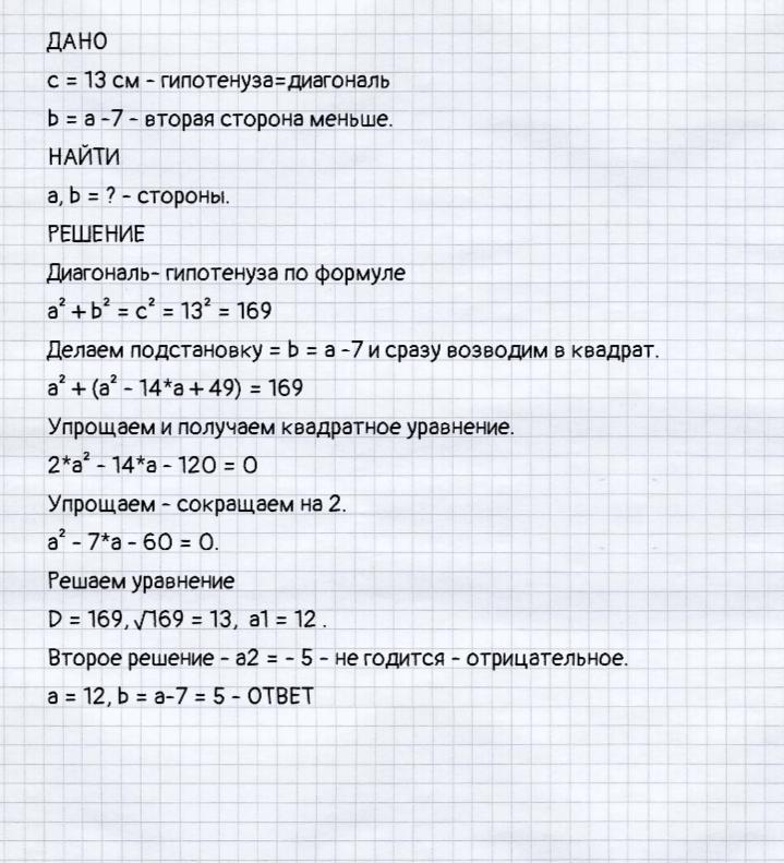 диагональ прямоугольника равна 13 см.Найдите стороны прямоугольника,если известно,что одна из них на 7 см меньше другой. а) составьте систему уравнений по условию задачи. б) дайте ответ на вопрос задачи,выполнив необходимые вычисления.