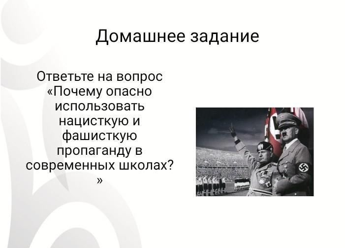 Пропаганда в переводе вроде как возбуждение, т.е. пробуждение как бы. Любая идея несёт в себе какие-то алгоритмы в психике и динамике людей. А значит эти алгоритмы могут быть задействованы. Т.е. запущены в обществе. И куда могут привести нацистская и фашистская идея? Опыт уже показал куда...