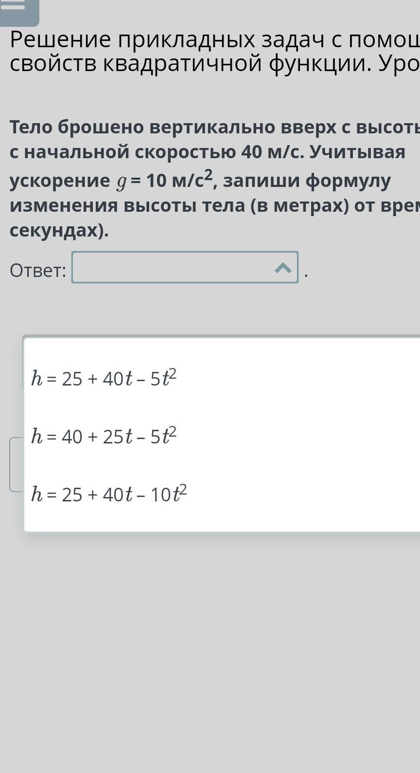 Тело брошено вертикально вверх с высоты 25 м с начальной скоростью 40 м/с. Учитывая ускорение g = 10 м/с2, запиши формулу изменения высоты тела (в метрах) от времени (в секундах).