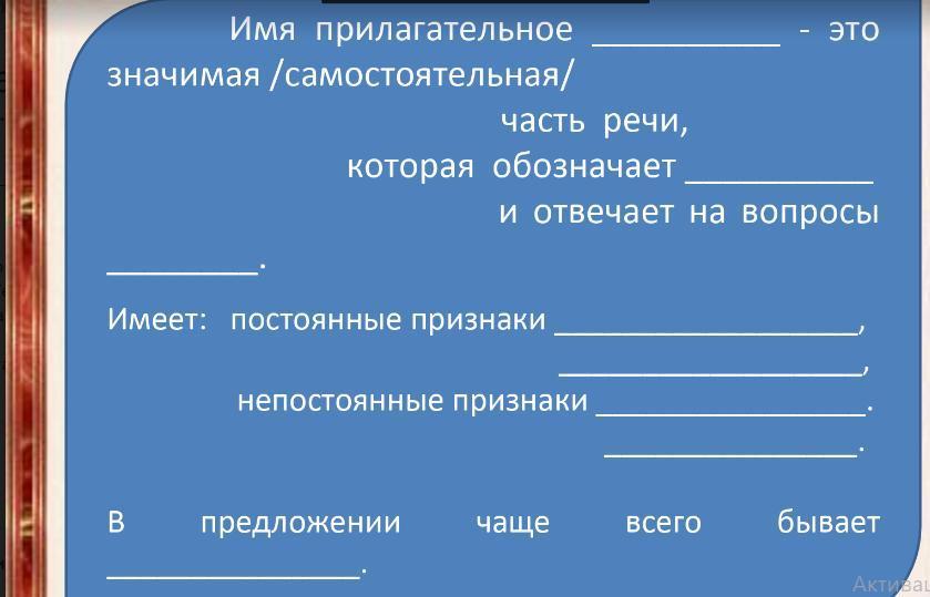 имя прилагательное- это самостоятельная часть речи, которая обозначает признак предмета и отвечает на вопросы какой?», «какая?», «какое?», «какие?», «чей?» и так далее.