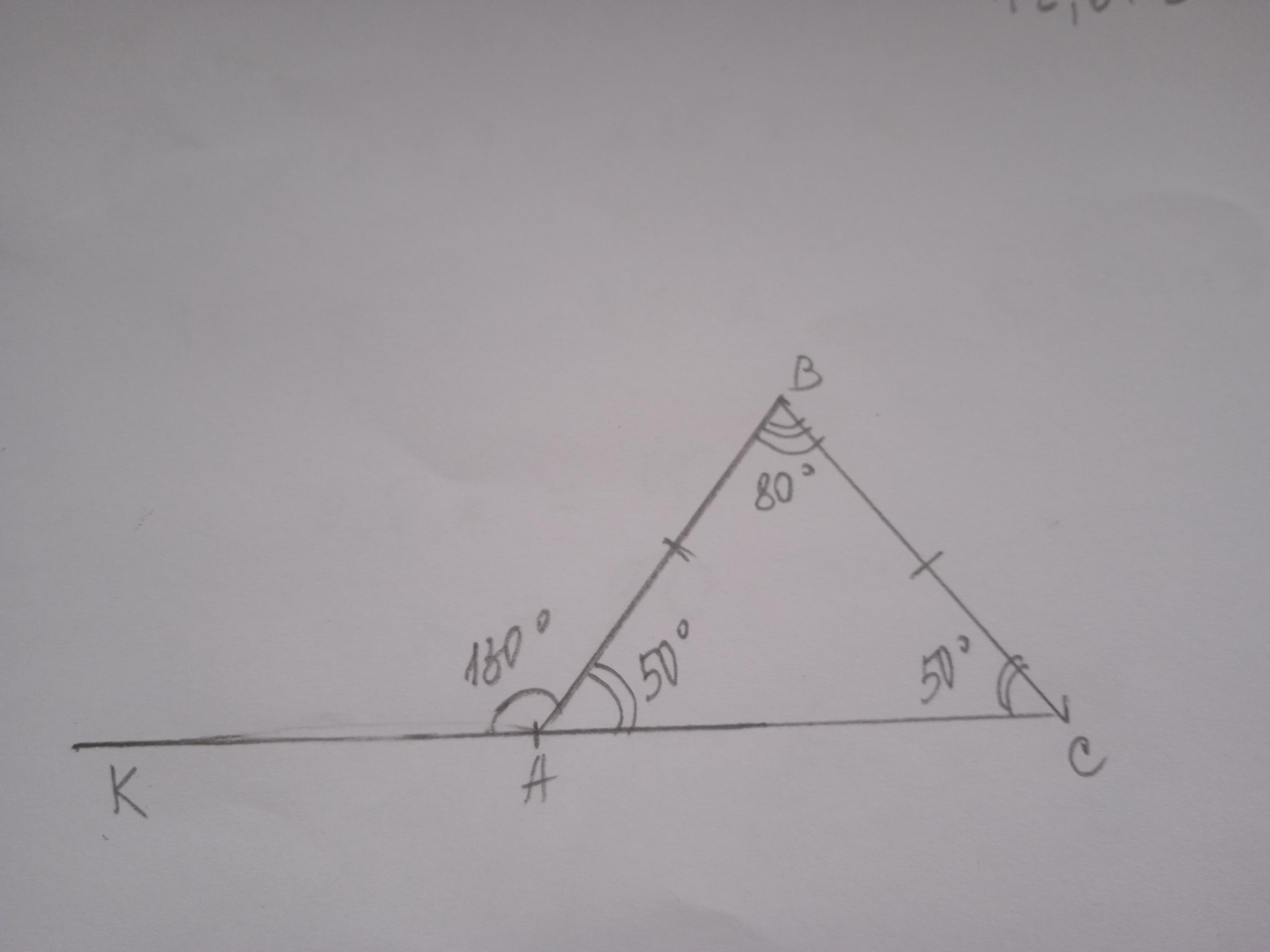 Дано: ΔАВС, АВ=ВС, ∠КАВ=130°. Знайти ∠ВАС, ∠В, ∠С