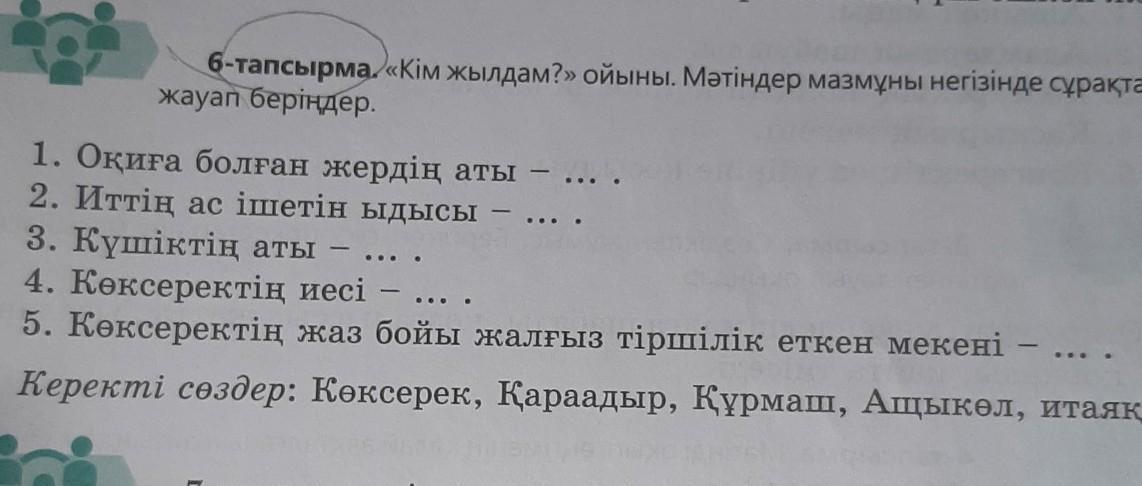 6-тапсырма «Кім жылдам?» ойыны. Мәтіндер мазмуны негізінде сұрақтарға жауап беріңдер. 1. Оқиға болған жердің аты 2. Иттің ас ішетін ыдысы 3. Күшіктің аты 4. Көксеректің иесі 5. Көксеректің жаз бойы жалғыз тіршілік еткен мекені ... Керекті сөздер: Көксерек, Қараадыр, Құрмаш, Ащыкөл, итаяқ. СРОЧНО НУЖНО