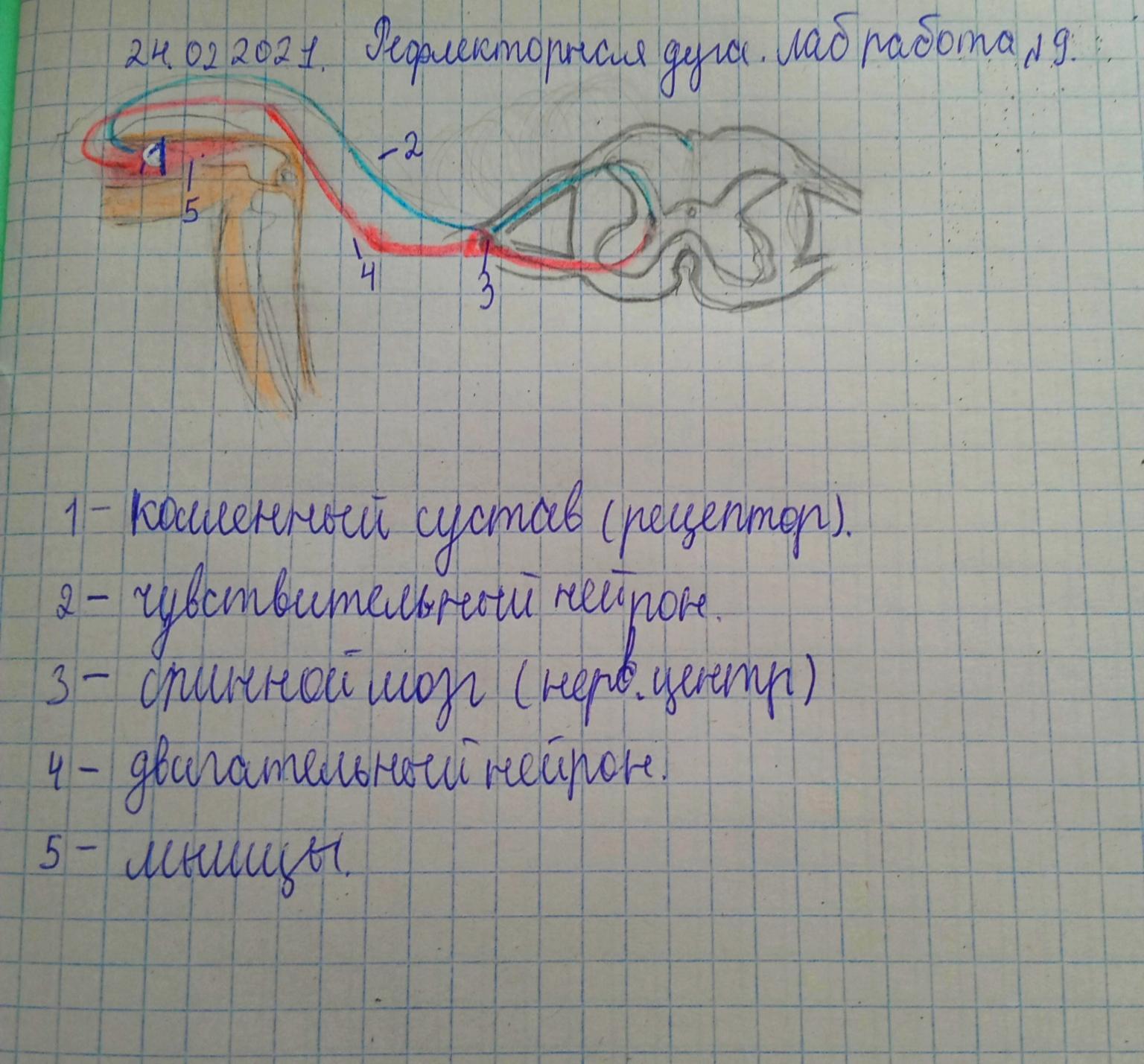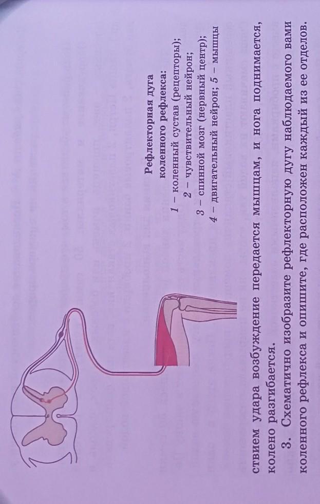 сти сухожильной связки чуть ниже коленной чашечки. Под воздействием ударом возбуждение передается мышцам , и нога поднимается , колено разгибает . 3. схематично изобразите рефлекторную дугу наблюдаемого вами коленного рефлекса и опишите , где расположен каждый из ее отделов