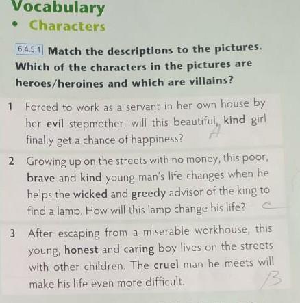 Match the descriptions to the pictures.Which of the character in the pictures are heroes /heroines and which are villains...