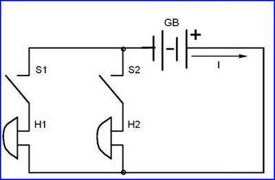 і двох дзвінків, кожен із яких вмикається своїм ключем. Покажіть на схемі стрілкою напрямок
