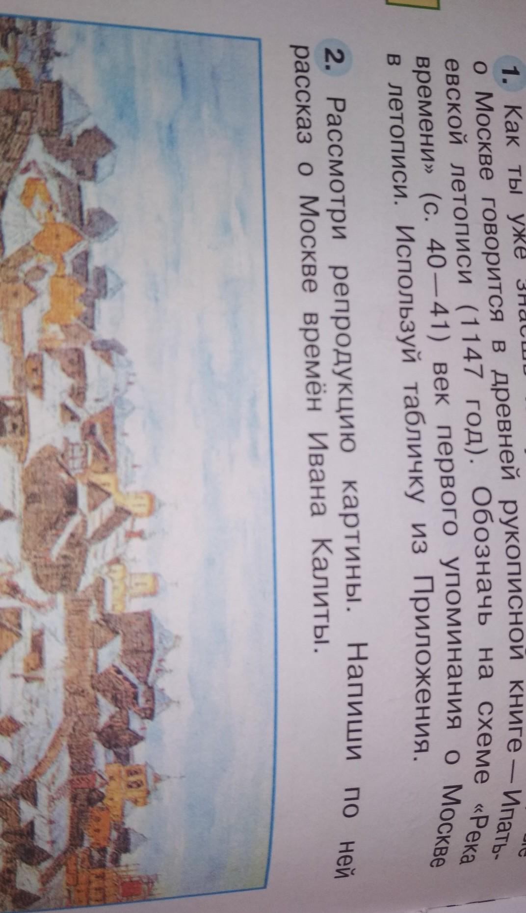 На картине Васнецова мы видим, что Москва 14 века была в основном деревянным городом, окруженным от неприятеля высоким забором.Расположенный на возвышенности город представлял собой довольно хорошо укрепленную крепость. Через Москву проходили важные торговые пути, что способствовало росту и развитию многочисленных мастерских, разбросанных по всему городу. Люди одной специальности, как правило, жили кучно: существовали целые улицы рыбаков, гончаров, кожевенных дел мастеров, торговцев и т.д.