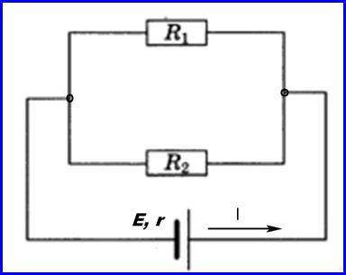 Цепь состоит из источника с ЭДС 7,5В и внутренним сопротивлением 0,3Ом и двух параллельно соединенных резисторов R1=3Ом и R2=2Ом.