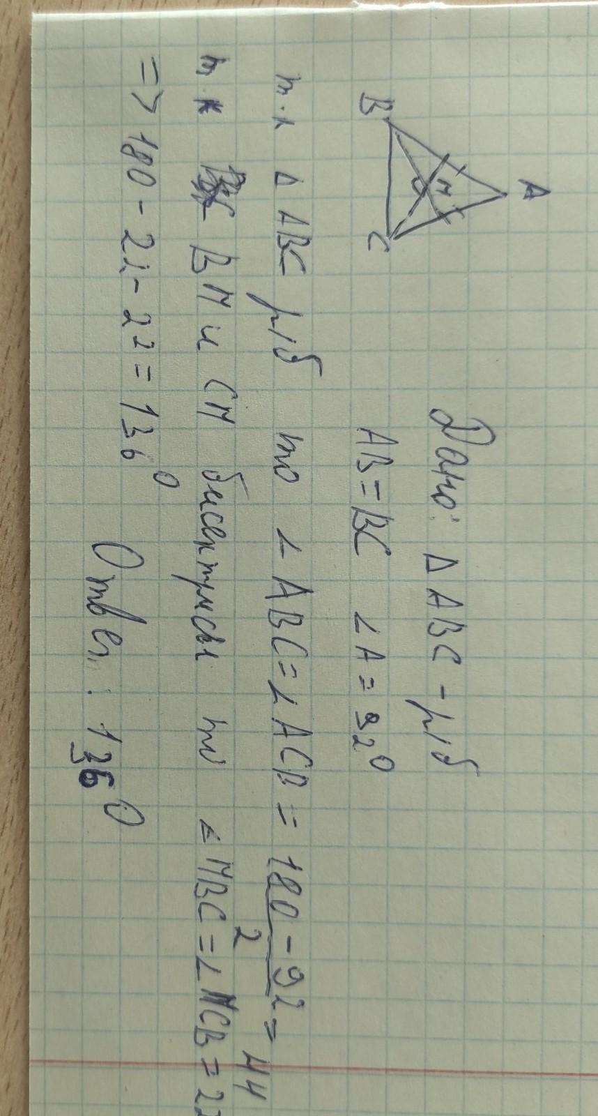 В треугольнике Авс стороны Ав и Ас равны, угол А равен 92°. Биссектриссы углов В и С пересекаться в точке М. Найдите величину угла ВМС