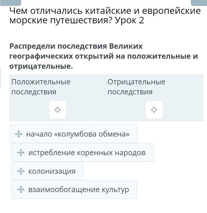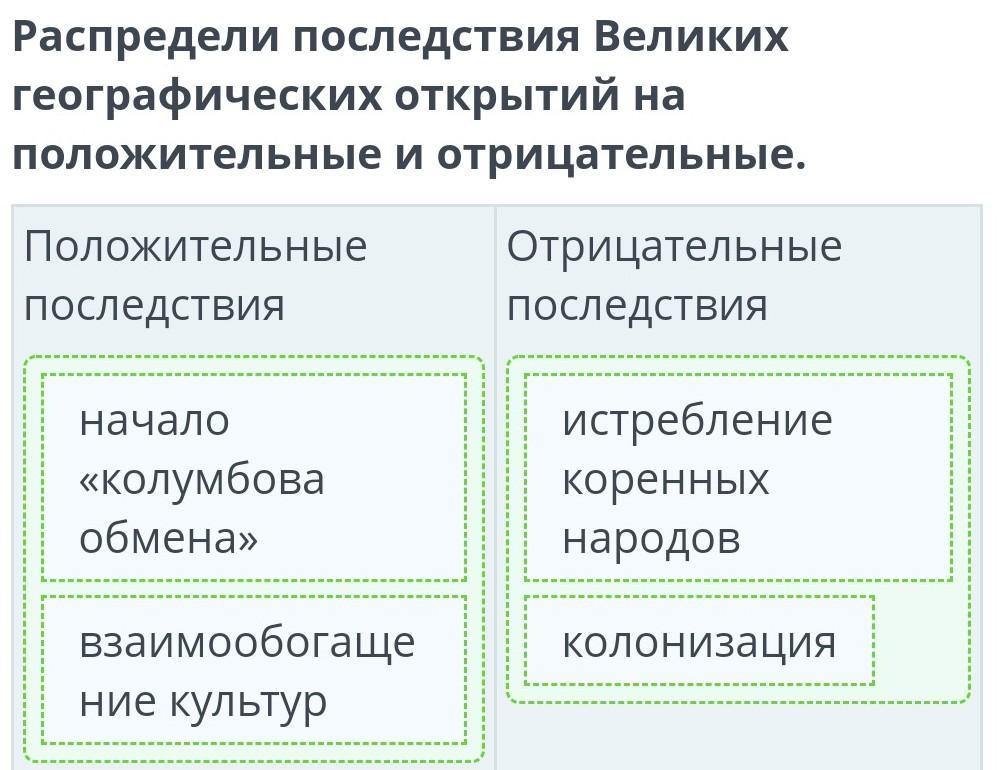 Распредели последствия Великих географических открытий на положительные и отрицательные.