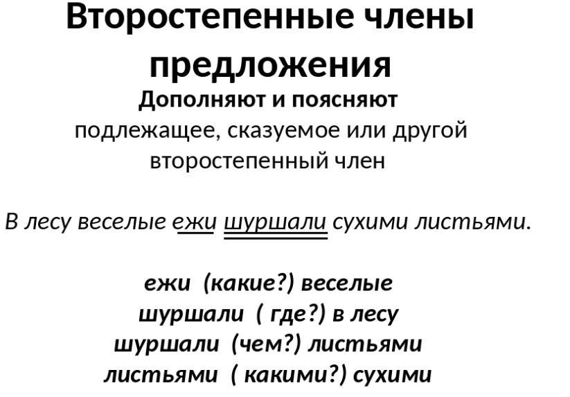 второстепеные члены предложения поясняют ______________________,____________________, или ___________________________________________.