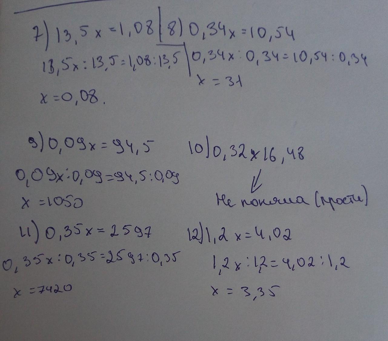 решите уравнение 7)13,5х=1,08 8)0,34х=10,54 9)0,09х=94,5 10)0,32х16,48 11)0,35х=2597 12)1,2х=4,02