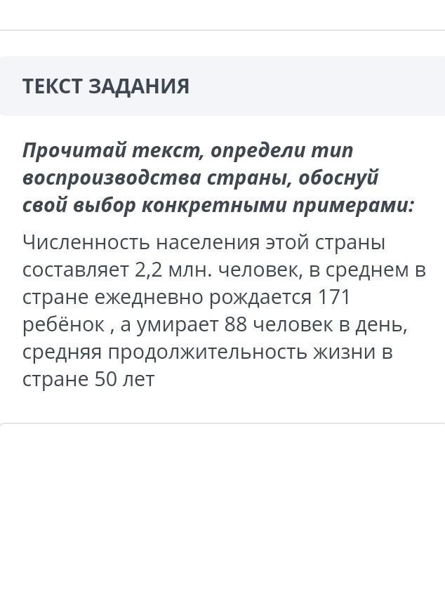 Прочитай текст, определи тип воспроизводства страны. обоснуй свой выбор конкретными примерами.