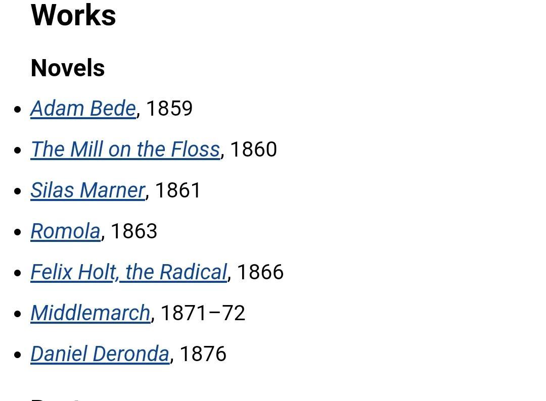 George Eliot Real name: 1.Mary Ann, or Marian, Cross . Born in 2).1819.. (year) Brother's name: 3) Isaac... Moved to London at the age of 4)..31. Published her first novel Adam Bede’ in 1859 Total number of novels: 6.) 7 Died in 7.)1880.