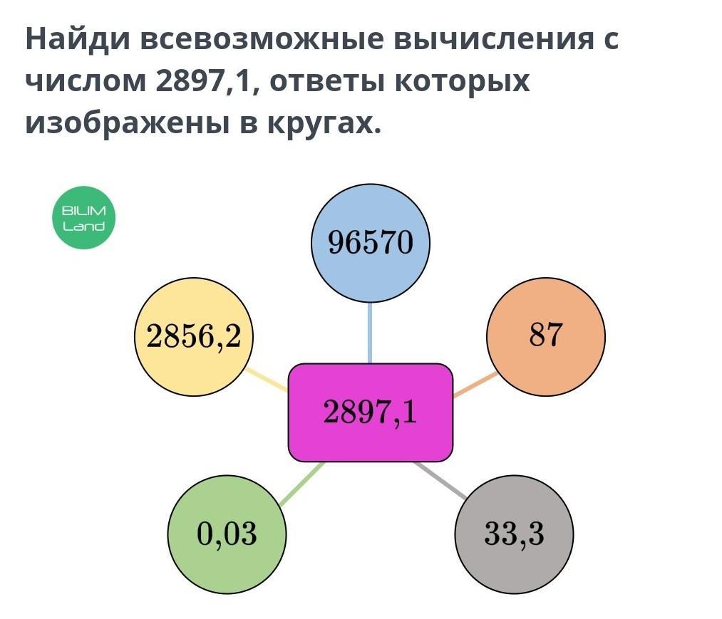 Найди всевозможные вычисления с числом 2897,1, ответы которых изображены в кругах.