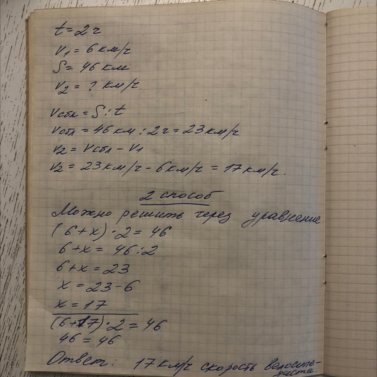 Пешеход и велосипедист отправились одновременно из двух посёлков навстречу друг другу. Через 2 часа они встретились. С какой скоростью ехал велосипедист, если скорость пешехода 6 км/ч, а расстояние между этими посёлками 46 км?