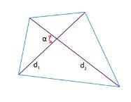 - Площадь произвольного выпуклого четырехугольника равна половине произведения длин его диагоналей на синус угла между ними.
